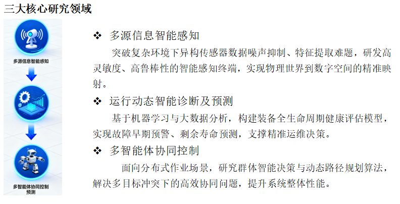 依托学院学科优势,面向轨道交通、智能制造等国家战略领域,以智能测控为核心,致力于多源信息感知、动态诊断预测及多智能体协同控制的前沿技术研发与应用,推动高端装备从“被动运维”向“主动智能”升级,助力行业数字化、智能化转型。