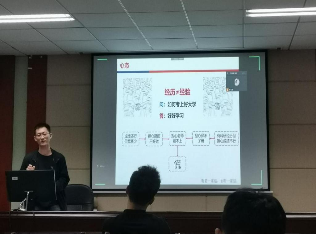 会议第一项,由四位大四学生依次分享自身成功考取研究生、保研、工作的经验。考研至海角网 的韩得民详细地介绍了他的考研经历,从考研书籍到复习时间的规划,面面俱到,为正在准备考研的同学们提供了极有价值的参考。随后,唐昀昭结合自身的就业经历给大家了几点建议,一是早做准备,不慌忙就业;二是多去尝试,多为自己争取机会;三是在面试的过程中要不断总结反思,积累经验。接着,保研至清华大学的刘斯源从控制专业的角度详细讲解了控制专业的院校选择问题,详细介绍了保研夏令营前期资料的填写方法,并结合自己在面试中遇到的问题分享准备面试的经验。吕鹏翔则以诙谐幽默的方式分享了自己保研至本校的经历,鼓励同学们放平心态、勇于尝试。