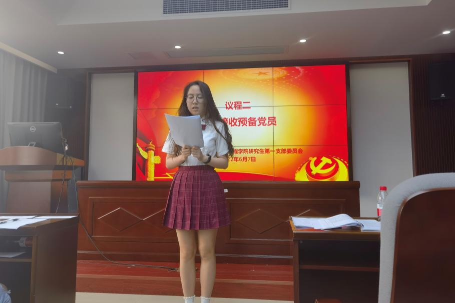 会议伊始,支部全体成员起立,奏唱国歌。随后,战映辰同志介绍了会议的流程及要求。首先,支部大会讨论接收预备党员相关事宜。然后,彭齐、刘昕怡、蒋志刚三位发展对象依次上台宣读《入党志愿书》,并详细介绍其个人基本情况、对党的认识的转变历程、入党动机以及理论知识学习情况。
