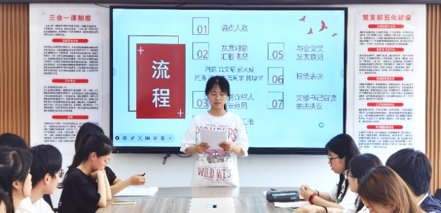 会议伊始,张佳琪同志对参会情况和大会流程作简要介绍。随后唐嘉同志宣读《入党志愿书》,着重汇报了本人基本信息、入党志愿、主要经历和家庭关系等。两位入党介绍人发表意见,陈灏同志代表支委会汇报审查情况,与会党员发表意见。支部依次讨论了周晓洁、闫涛、黄厚瑄、蒿柯宇、吉文韬、彭大成6位同志的入党问题,经无记名投票同意接收7位发展对象为预备党员。