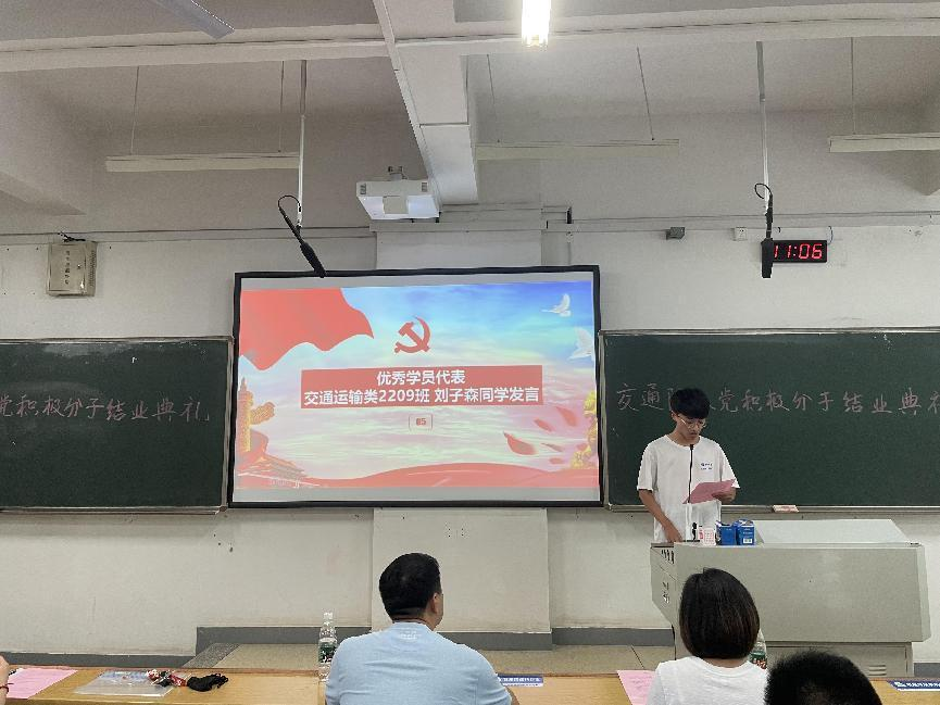 典礼第三项,交通运输类2209班刘子森同学作为优秀学员代表发言。他首先对此次培训班的全体授课教师与党组织给予这次学习机会表示感谢,并表示通过各项教学环节,他逐步明晰了中国共产党艰苦卓绝的奋斗历程,深刻体悟了党的二十大精神,系统了解了党的理论,提升了自身政治觉悟,明确了当代青年的历史使命担当,更加坚定了把青春奋斗融入党和人民的建设事业中,为实现中华民族的伟大复兴贡献青春力量。最后,他呼吁大家做“有理想,敢担当,能吃苦,肯奋斗”的新时代青年,在新时代的旷阔舞台上,绽放自己的青春色彩。