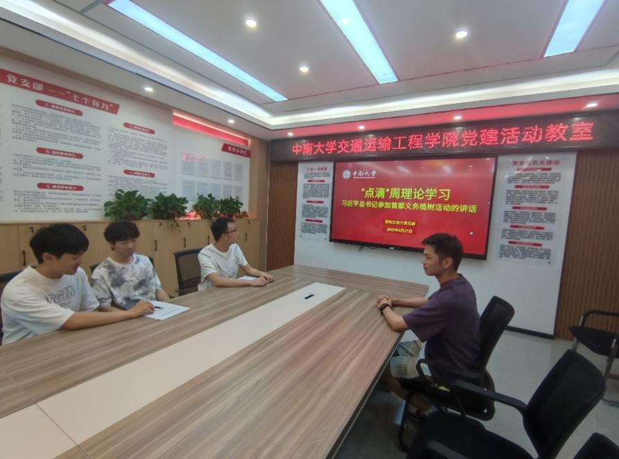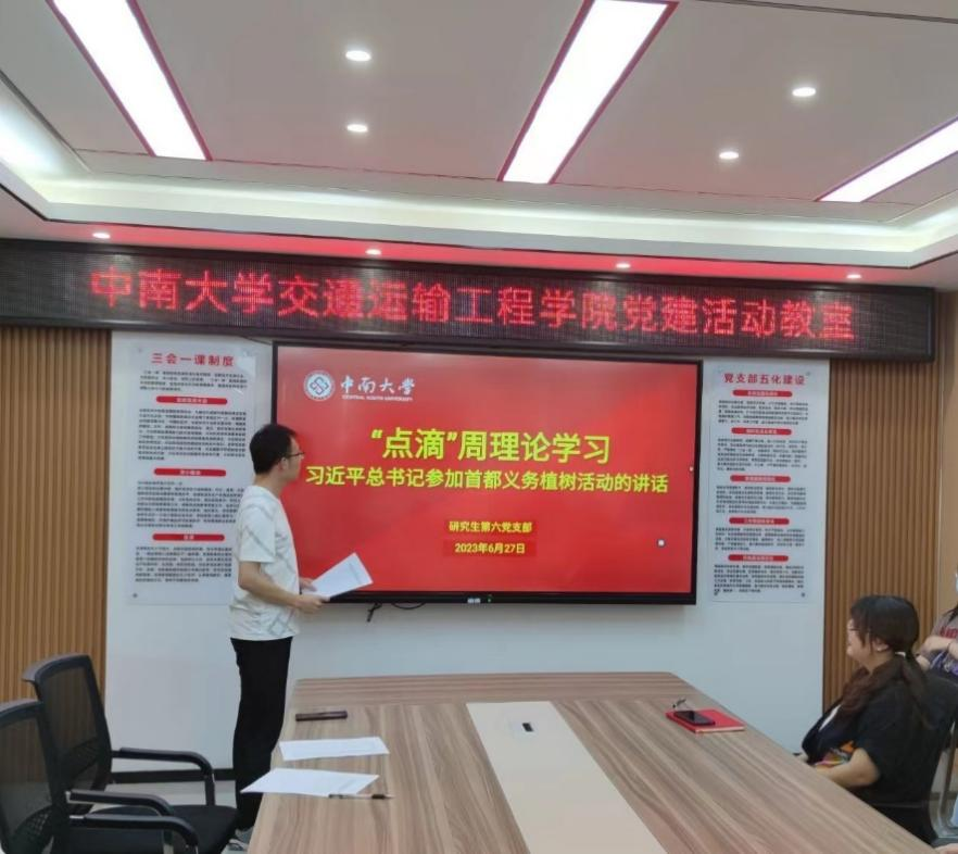 为督促支部同志加强理论学习,巩固主题教育成效,研究生第六党支部第五学习小组的成员在6月27日晚20:00在第一综合实验楼党建活动室开展主题教育学习讨论,共同学习习近平总书记参加首都义务植树活动的讲话精神。学习小组组长周少宇担任本次学习讨论主持人。