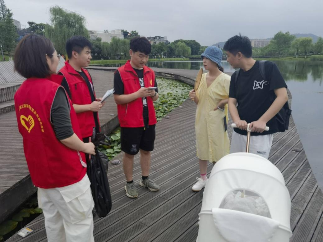 在感知生态、捡拾垃圾的过程中,同志们还对垃圾分类开展了宣传活动。为了调动群众参与的积极性,宣传活动采用小问答的方式进行,成员选择一些具有实用性的垃圾分类小问题询问群众。面对面的问答形式区别于讲解,更能调动居民群众对活动的积极性、提高其参与度,实用的小问题也更贴近生活,加强了宣传与生活的联系,使宣传更深入人心。