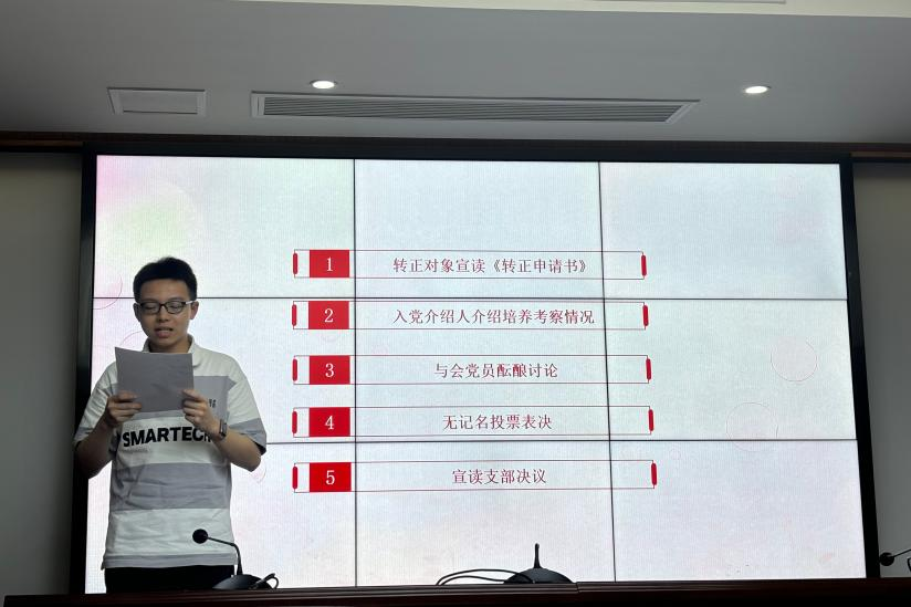 会议第二项,讨论梅杰、董光裕和马晓慧三名预备党员转正的事宜。首先,三位预备党员依次宣读了转正申请书,向支部汇报了预备期内在政治思想、学习生活和工作表现等方面的基本情况,并进行了自我总结和批评。