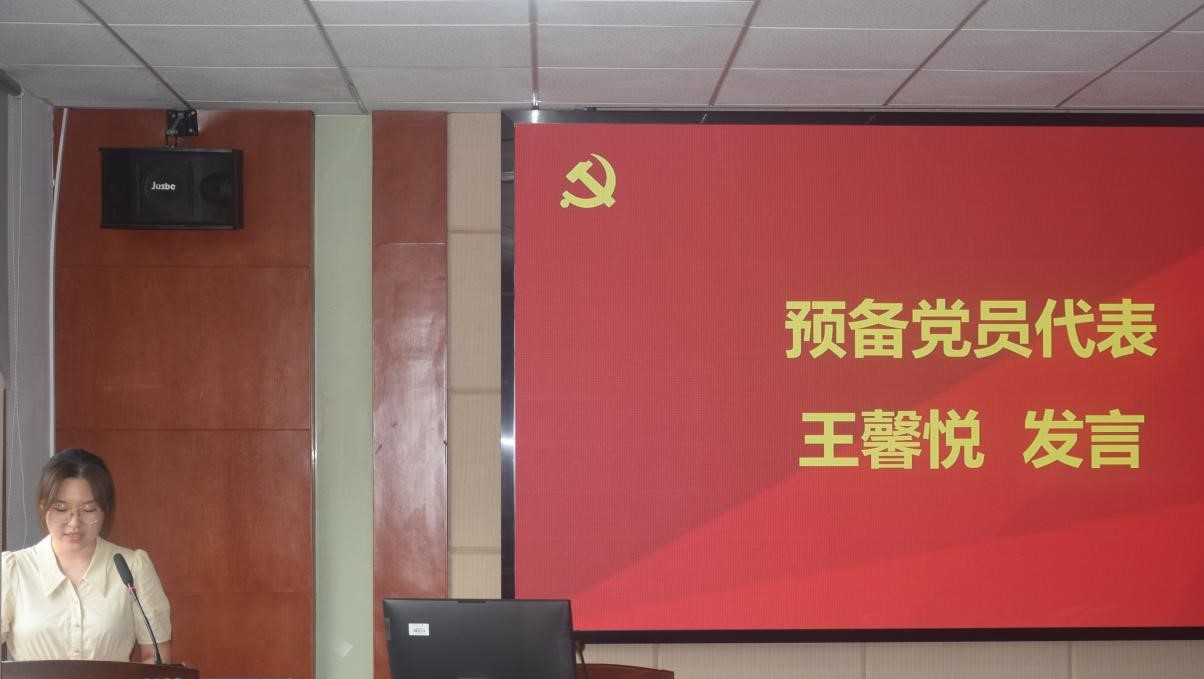 预备党员代表王馨悦同志发言。王馨悦表示,作为一名预备党员,要时刻保持清晰的头脑,努力提升自己的思想觉悟,发挥先锋模范作用,在工作中以身作则带领身边同学共同进步;同时应虚心向优秀党员学习,勇于担当,不断提升自己的综合素质,随时准备承担更大更光荣的使命和任务。