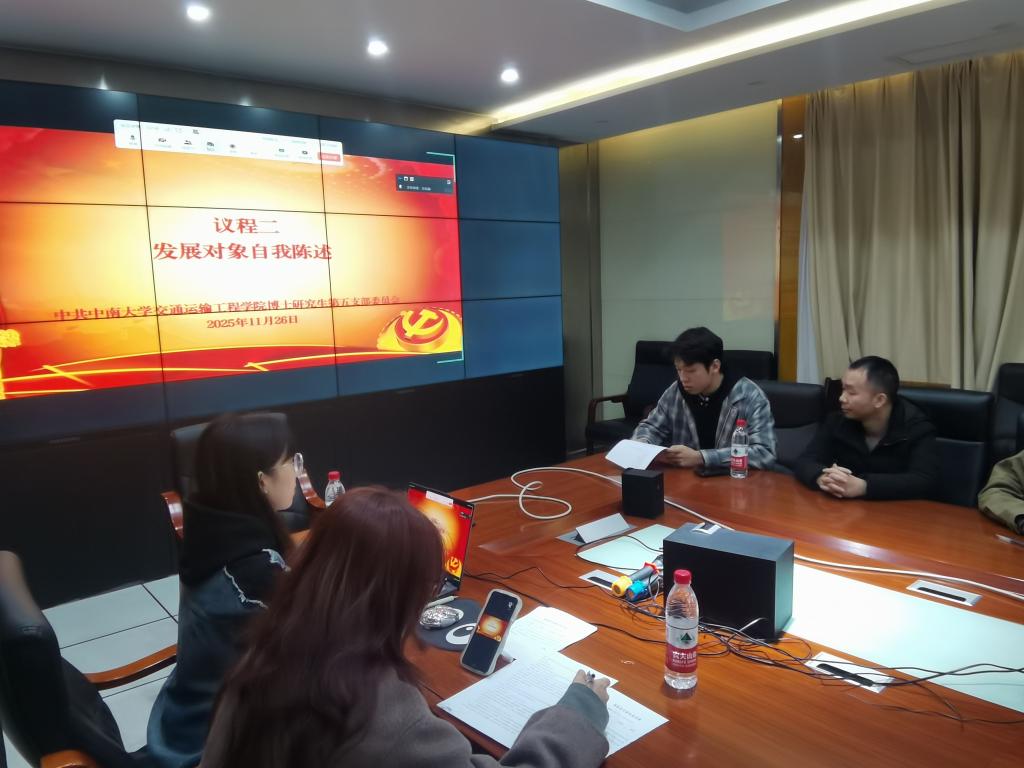为进一步加强基层党组织建设,通过吸纳新鲜血液壮大党员队伍,同时深入学习贯彻党的最新理论成果,提升博士生党员的政治素养与宏观视野,2025年11月26日晚20:00,海角网 博士研究生第五党支部在交通楼518会议室隆重召开支部党员大会。本次会议由党支部副书记王钰涵同志主持,主要议程包括讨论接收文梦凡同志为中共预备党员以及集中学习党的二十届四中全会精神,会议应到有表决权党员21人,实到17人,线上参会4人,根据《中国共产党章程》和《中国共产党发展党员工作细则》的有关规定,符合法定开会人数。