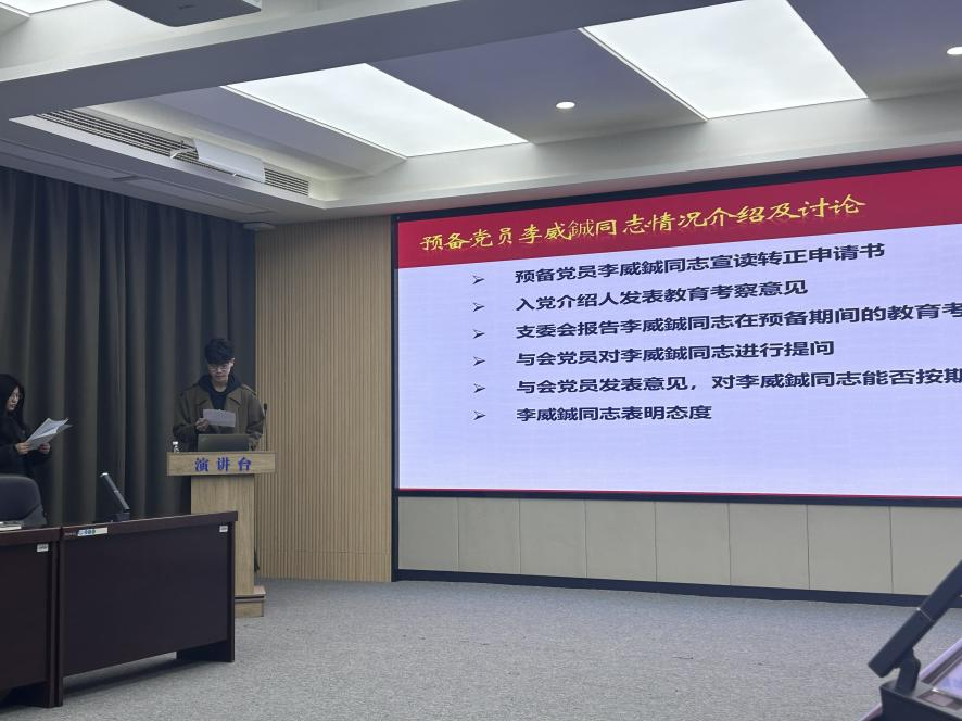 随后,会议进入党员发展相关事宜审议阶段。首先讨论预备党员李威鋮同志转正申请,按照规范议程,李威鋮同志宣读了转正申请书,详细汇报了预备期间在思想、学习、工作等方面的成长与不足。入党介绍人全面介绍了其一年来的考察情况,支委会报告了教育考察结果并提出转正意见。与会党员提问交流,充分发表意见,对李威鋮同志的进步给予肯定,同时提出改进建议。经无记名投票表决,大会一致同意李威鋮同志按期转为正式党员。