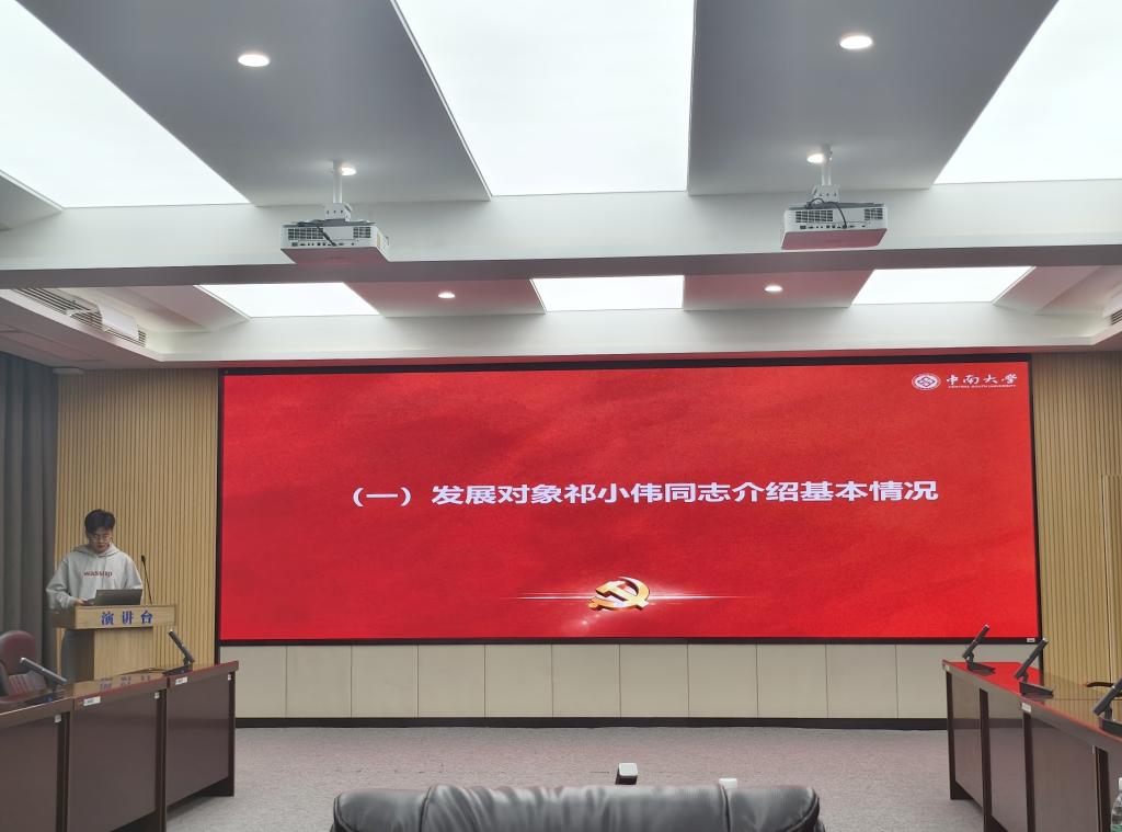 会议第三项议程为讨论预备党员接收事宜。首先,周舒佳、祁小伟两位同志逐一上台宣读入党志愿书,向大会汇报个人对党的认知、入党初心及思想工作表现等情况。随后,两位发展对象的入党介绍人分别介绍了他们在作为入党积极分子期间的考察情况,一致认为两位同志入党动机端正,积极向党组织靠拢,具备成为预备党员的条件。接着,支委会宣读对发展对象的审查报告。经支部委员会审查,周舒佳、祁小伟两位同志政治历史清楚,直系亲属及主要社会关系拥护党的领导,党内外群众评价良好,符合党员发展条件。与会正式党员进行充分讨论后,大会以无记名投票的方式进行表决,根据投票结果与支部大会讨论决定,同意接收周舒佳、祁小伟两位同志为中共预备党员。