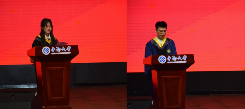 接着,本科生毕业生代表胡叶涵、研究生毕业生代表刘家宝相继发言。他们回顾了在学校期间的点点滴滴,表达了对母校、学院、老师、亲朋好友的感激之情和美好祝愿。他们呼吁,毕业生们应不忘初心,牢记使命,以中南学子的责任与担当,让青春在服务国家发展、助力民族复兴中绽放绚丽之花!