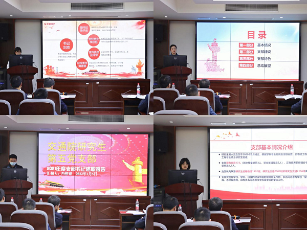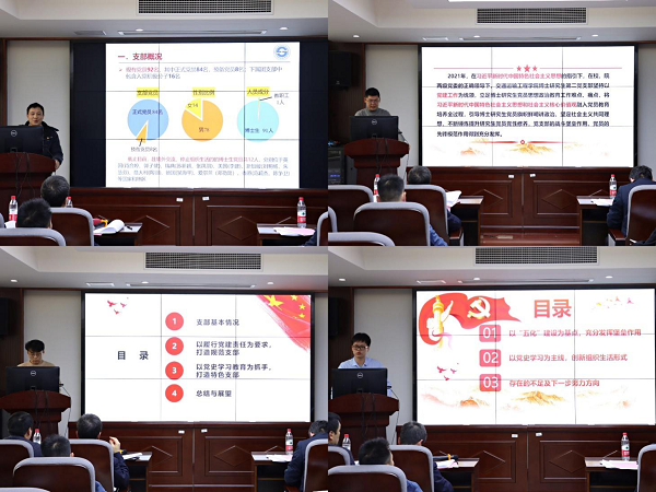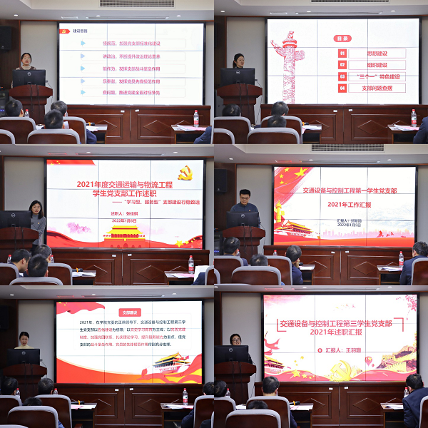 首先由各个支部书记就本年度支部和个人工作进行述职,最先进行汇报的是教职工党支部书记。交通运输系教工党支部、交通设备与控制工程系教工党支部、物流工程系教工党支部、高速列车研究中心教工党支部的4个支部书记分别从支部2021年的基本工作情况、书记的履职情况、教职工党员这一年的海角网