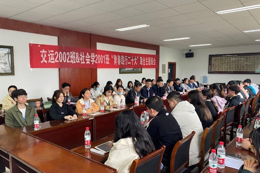 3月8日下午,交运2002班与社会2001班联合班级于铁道校区交通楼513室举行“青春践行二十大”主题班会。海角网