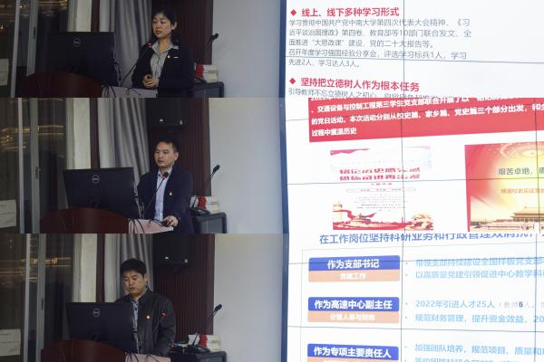 会议采取“一述一评”方式进行,述职一个,点评一个。会议伊始,教工党支部的支部书记进行述职。3位书记围绕本支部实际工作,重点介绍了一年来教职工党员在立德树人、课程思政、学科建设等方面的建设成果,实事求是查摆了支部存在的问题并提出了下一步工作整改措施。对此,学院党委书记贺志军提到,教工党支部持续推进党建与教育教学工作深度融合,充分发挥了应有的引领作用,但在支部活动丰富性和工作方法论的创新上还有待改进。