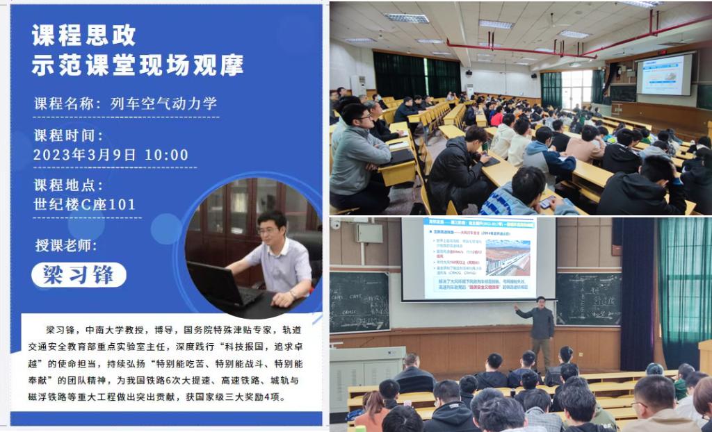 2023年3月9日,在铁道校区世纪楼C座101教室,高速列车研究中心梁习锋教授向研究生们讲授列车空气动力学课程,并有20名教师参与到课程思政示范课堂现场观摩。在课程讲授过程中,梁习锋教授生动地融入了我国高铁发展过程中海角网
