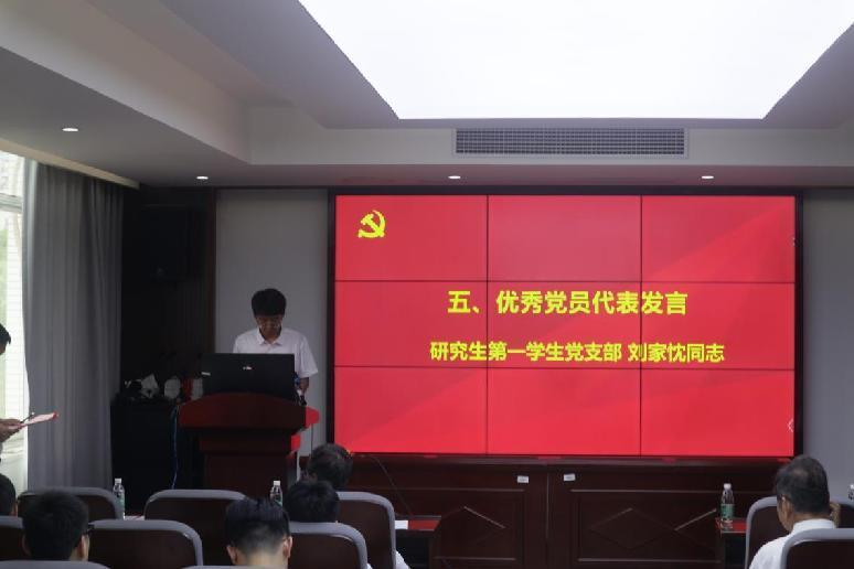 在颁奖仪式后,优秀党员代表刘家忱发言。他就个人在学院的成长历程、党支部的工作以及作为学生党员的责任和决心讲述自己的心路历程,表达了对学校、党组织的感激之情;并借此机会表达了三点决心:第一,提高海角网