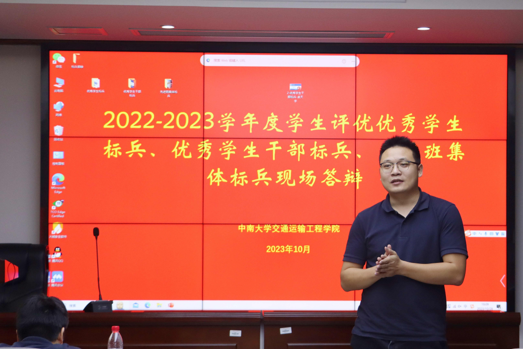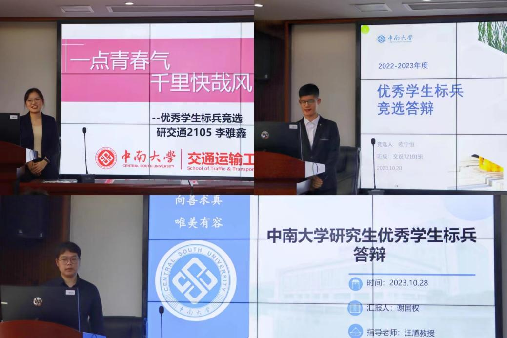 2022-2023学年度优秀学生标兵、优秀学生干部标兵、先进班集体标兵答辩于铁道校区交通楼425举行,班导师及专业教师代表关维元,辅导员代表丁德孝、蔡明旭、王羽珊、王尚君老师,学生代表陈粤、肖博懿担任本次答辩评委。本次答辩由丁德孝老师主持,共有5名优秀学生标兵,5名优秀学生干部标兵,4名先进班集体标兵负责人参加本次答辩。