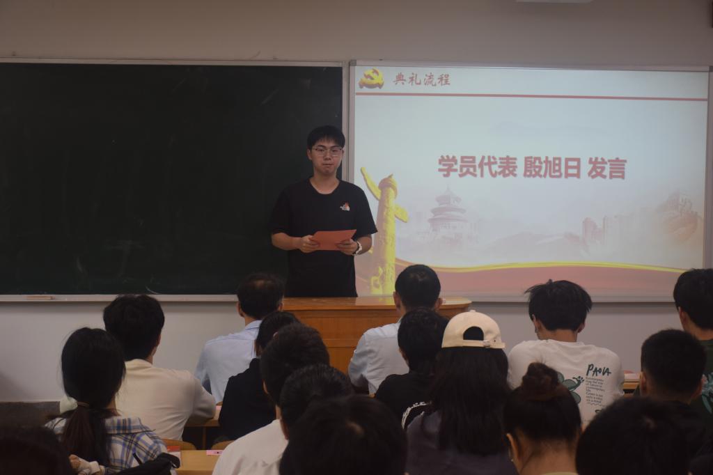 典礼第三项,培训班学员代表——交通运输第二学生党支部殷旭日发言。殷旭日同学带领全体学员回顾了中国共产党百年奋斗历程,阐述了党的精神力量对青年一代的重要指引作用。他号召全体学员珍惜此次培训机会,提升思想觉悟,锤炼道德修养,坚定理想信念,努力成长为党和国家所需的高素质人才。作为本期培训班的一员,殷旭日同学代表全体学员郑重承诺,将严格遵守培训纪律,积极投入学习实践,在思想和行动上不断进步。同时,他也期许所有学员在本次培训中学有所悟,学有所成。