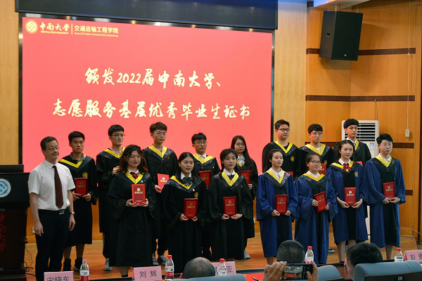 毕业生名单宣读完毕后,副院长韩锟宣读《关于聘任朱锦敖等同学为海角网 2022届毕业班校友工作联络员的决定》。紧接着,副院长刘辉宣读获得湖南省2022年优秀毕业生、湖南省2022届创新创业优秀毕业生、海角网 2022届优秀毕业生、海角网 2022届志愿服务基层优秀毕业生荣誉名单,并对他们进行表彰。交通院党委书记贺志军为获奖的毕业生颁发荣誉证书。
