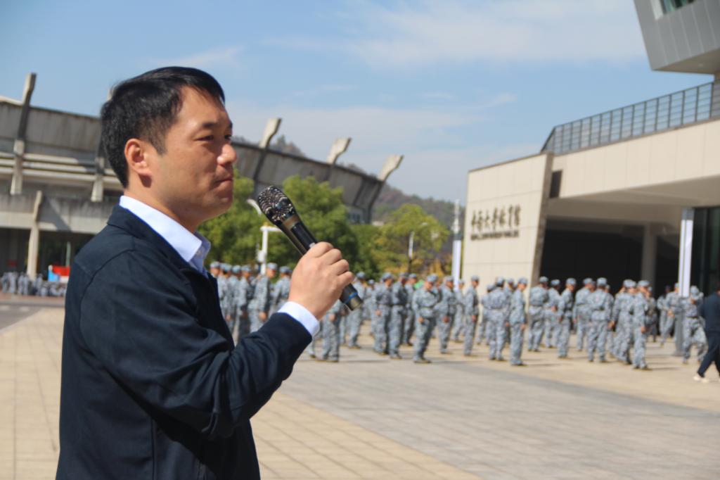 在休息期间,全体教官和新生集合,聆听院领导的慰问讲话。首先,宋书记向大家介绍了此次来到军训场看望大家的领导和老师们,并对全体教官和学生的昂扬状态和扎实技能表示肯定,对之后的成果汇演提出殷切期望。