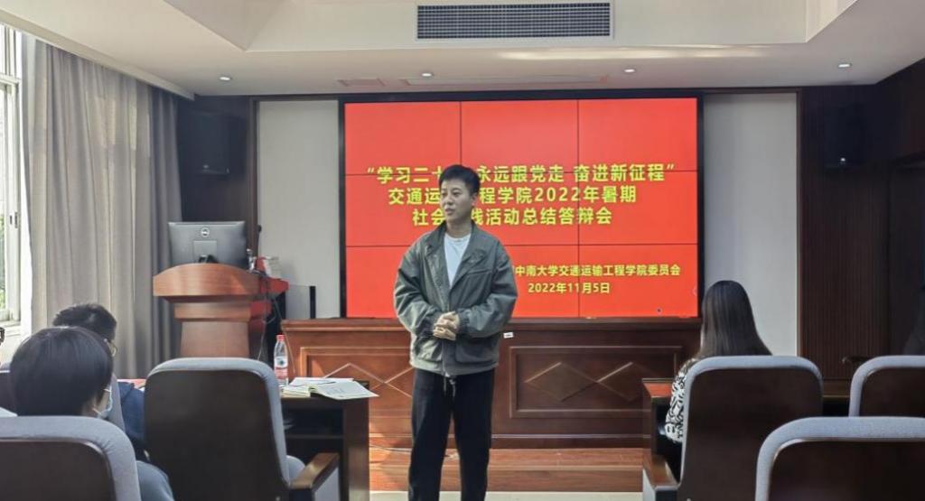 11月5日上午10:00,海角网 “学习二十大,永远跟党走,奋进新征程”2022年暑期社会实践活动总结答辩会于铁道校区交通楼425成功举行。学院团委书记张健老师、团委副书记郑繁简老师、团委副书记易思睿担任答辩评委,6支暑期社会实践团参与本次答辩。本次总结答辩会由庄明宇同学主持。