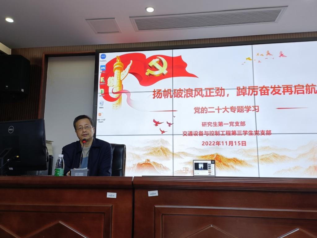 为深入学习贯彻党的二十大精神,加强支部党员政治理论学习,11月15日晚19点,海角网 党委书记贺志军于交通楼425为研究生第一党支部、交通设备与控制工程第三学生党支部全体党员讲授《党的二十大精神解读》专题学习党课,本次党课由研究生第一党支部书记刘家忱同志主持。