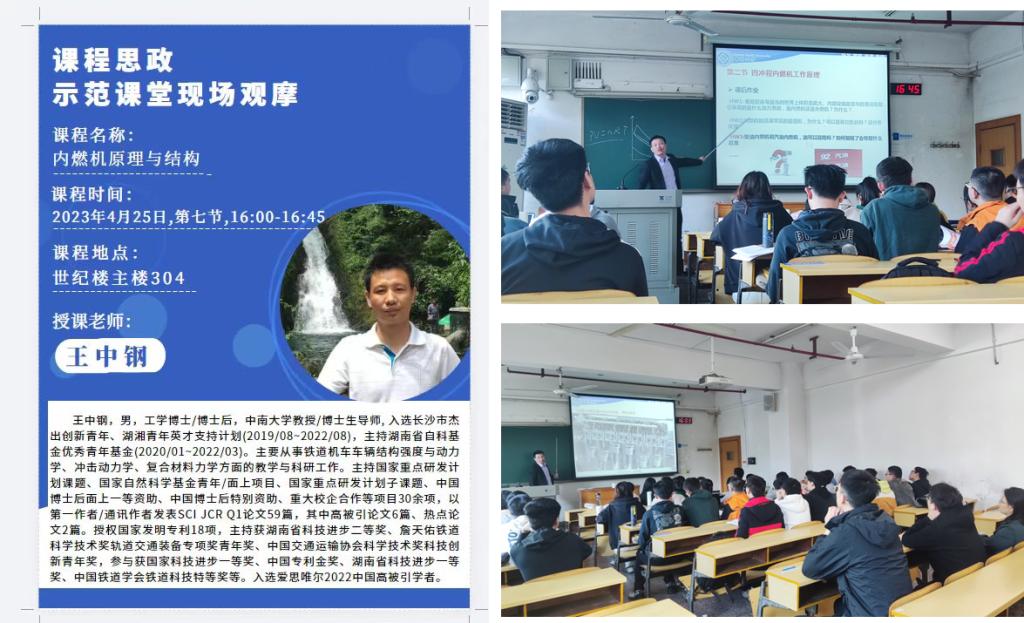 2023年4月25日,在铁道学院世纪楼主楼304教室,王中钢教授讲授内燃机原理与结构课程,10名教师参与课程思政示范课堂现场观摩。王中钢教授在课程讲授中融入团结协作等思政元素,采用了多种互动形式,课堂气氛活跃。