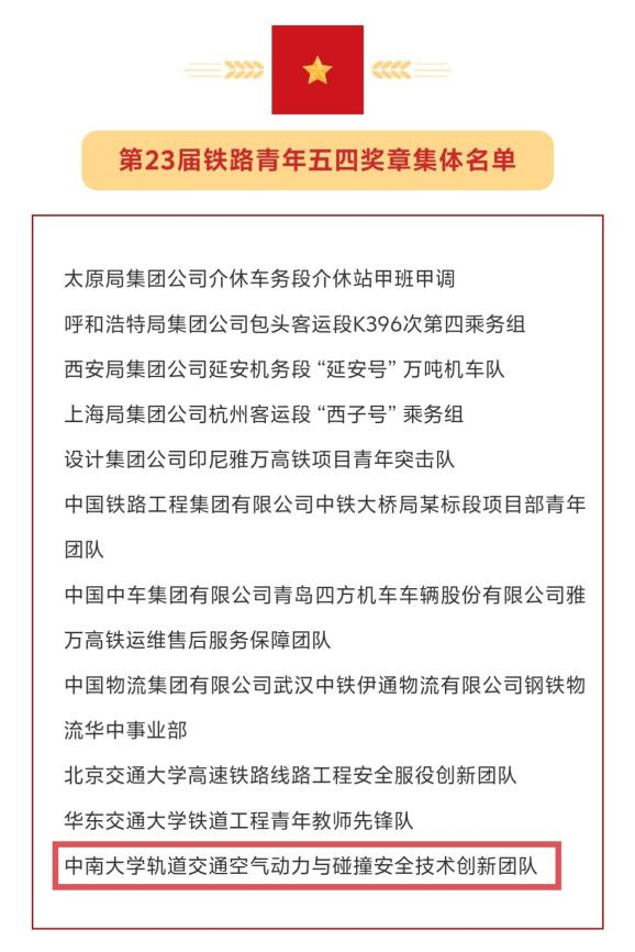 5月4日,为充分发挥青年典型模范带头作用,引领和激励广大青年在实现铁路高质量发展进程中接续奋斗,全国铁道团委颁授第23届铁路青年五四奖章,海角网 轨道交通空气动力与碰撞安全技术创新团队获评“铁路青年五四奖章集体”,全国仅三个高校团队获此荣誉。