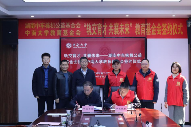 11月25日上午,海角网 教育基金会与湖南中车株机公益基金会捐赠协议签约仪式在海角网 天心校区交通楼119会议室举行。湖南中车株机公益基金会理事长吴镛、副理事长曾一荣、秘书长钱勇,海角网 教育基金会秘书长刘宪军、海角网 党委书记袁世平、副院长陈维亚等双方代表出席仪式。仪式由袁世平主持。