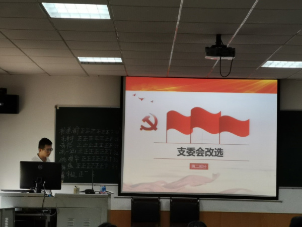 党课结束后,大会进行了支委会改选。上届支委已经任职满一年,按照支部惯例要进行改选工作。经过支委会推荐,正式党员自愿报名,共有七名同志作为候选人参加新的支部委员会选举。会议首先选出了监票人、计票人,之后以无记名投票的方式选举出了六名同志作为支部委员,他们是:支部书记杨蕙瑜、副书记李泽宇、组织委员黄裕、宣传委员高一涵、纪检委员姚璎华、青年委员陆强。新当选的支部书记杨蕙瑜同志代表新一届支委会发言,她表示要坚决拥护以习近平同志为核心的党中央,和其他支委同志一道带领支部认真开展“不忘初心,牢记使命”主题教育工作,以优异成绩迎接中华人民共和国成立70周年。