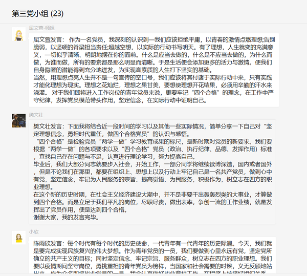 陈雨欣同志认为作为青年党员的一员,大家要做到心里永远有党,坚定党所确立的共产主义的目标。在当下要认真做好毕业离校工作,转接好组织关系、过好组织生活、按时缴纳党费。今后无论在任何岗位,都要认真完成工作,积极为他人服务,起到党员的先锋模范作用。