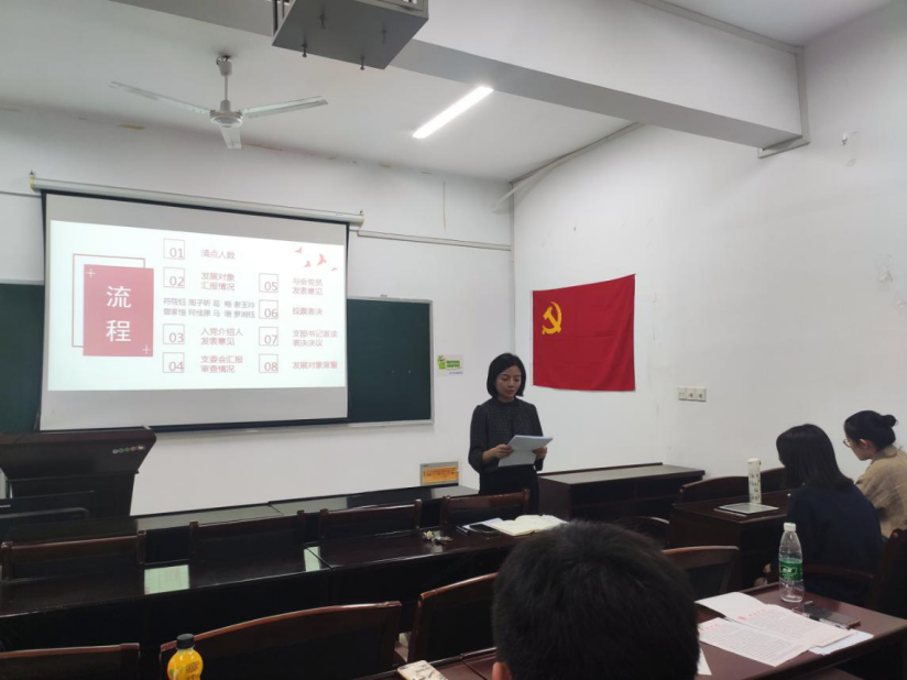 会议伊始,李晨辉同志简单介绍了会议流程及要求,之后符筱钰、周子昕、葛畅等八位发展对象依次上台宣读《入党志愿书》,由入党介绍人分别介绍其基本情况并发表意见,支委会汇报审查情况,与会党员同志发表意见。八位发展对象在考察期内思想,学习,工作和生活上积极向党组织靠拢。经无记名投票,最终八位发展对象都全票通过了此次审核,支部大会宣布了接收本期发展对象为预备党员的决议。符筱钰等八名同志表示自己一定不辜负党组织的信任,时刻以一名共产党员的标准严格要求自己,充分发挥好党员的先锋模范作用,不断加强自己的党性修养,积极为建设党支部付出力量。之后,刘泽林同志带领此次新发展的预备党员同志们在党旗下进行了入党宣誓。