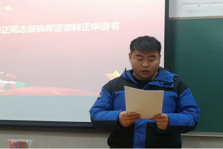 大会分为预备党员转正和支部书记总结两项议程。首先,由邓涵文、裴晓晖、郭冬阳、张楚瑶四位同志先后宣读自己的转正申请书。邓涵文等四位同志从自身实际出发,以思想、学习、生活、工作四个角度为切入点,总结汇报了自己在作为预备党员期间的进步表现,同时也认真指出了自己的不足,表达了自己始终为成为一名优秀的共产党员而奋斗的决心,恳请党组织在实践中考察和检验。