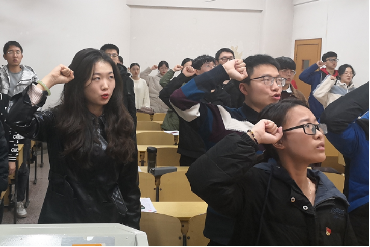 讨论过后,与会正式党员进行无记名投票,一致通过了邓涵文等四位同志如期转为正式党员的申请,大会审议并宣读决议。最后,由张楚瑶同志领誓,全体党员同志进行了庄严的入党宣誓。
