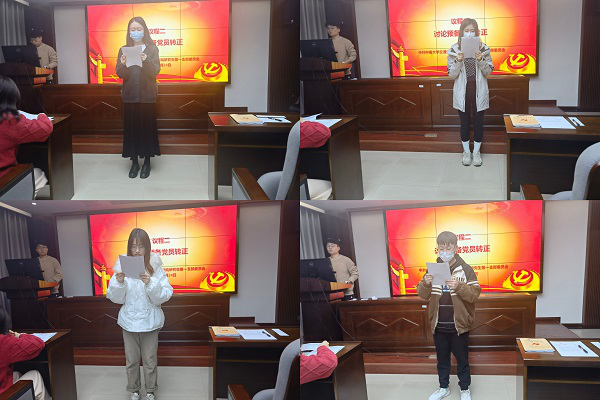 四位同志发言结束后,组织委员战映辰同志代表支委会向支部大会报告征求党员和群众意见情况及支委会意见。经支部党员充分讨论并发表意见后,正式党员无记名投票,通过了刘洋、闫璐云、梁瑷兰、胡冉四位同志的转正申请,支部副书记肖杨同志宣读了表决决议。