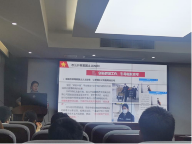 之后,任琭老师结合自身的工作经历,就如何在大学开展爱国主义教育分享自己的想法。她提到,学校、学院指导学生党支部开展形式多样的主题教育活动,目的是让同志们在潜移默化中增强爱国主义精神,而不断创新党团工作也应当是支部党员影响身边群众的着力点和落脚点。最后,她以习近平总书记的“爱国三问”结束此次党课,并希望同志们能将此次党课的精神融入到之后的学习工作中。