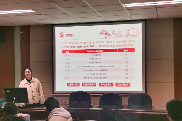 会议伊始,支部书记陈晨老师从思想建设、组织建设、“三个一”特色建设和支部问题查摆等四个方面对支委一年来的工作进行述职。她指出,这一年以来,支部建设取得了很大的进展与成就。在思想建设方面,支部充分利用“学习强国”开展党员学习教育活动,其中支部蒋艾佳同志入选海角网 2021年学习强国积分最高前10名。在组织建设方面,做到“组织生活常态化”、“管理服务精细化”、“工作制度体系化”、“宣传工作规范化”,促进支部体系完整、运行高效。在特色建设方面,支部定期开展“启读坊”、“学党史”、“办实事”的活动,充分发挥了支部的战斗堡垒作用。
