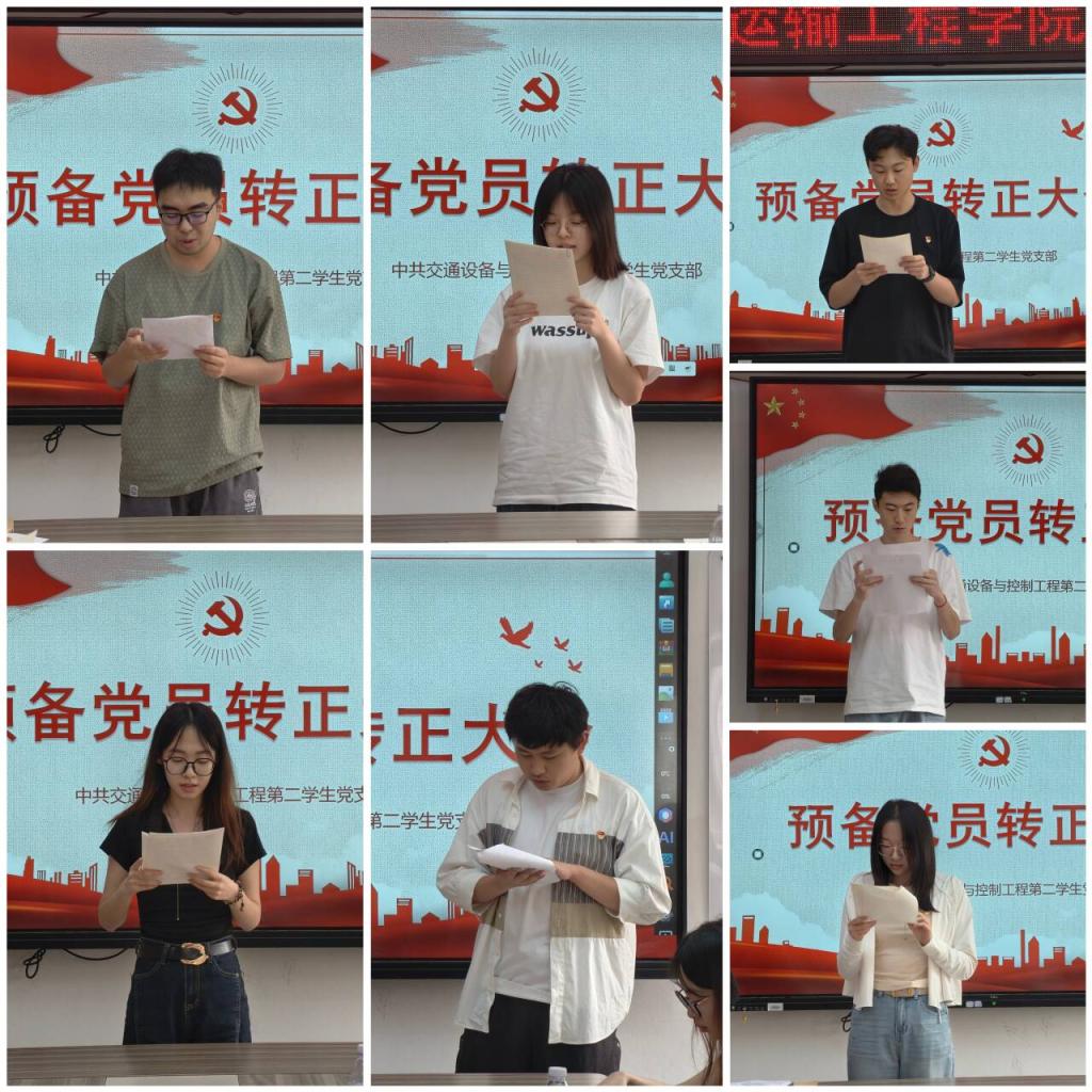 2025年6月13日,交通设备与控制工程第二学生党支部在学院党建活动室召开预备党员转正大会,会议严格按照党员发展程序,审议并表决通过了刘轩廷等7名预备党员的转正申请。本次会议由支部书记张健同志主持。