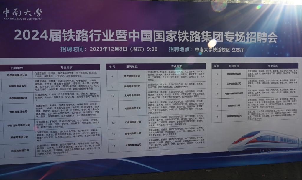 本场专场招聘会邀请了中国国家铁路集团19家子单位,分别是哈尔滨局集团公司、沈阳局集团公司、北京局集团公司、太原局集团公司、呼和浩特局集团公司、郑州局集团公司、武汉局集团公司、西安局集团公司、济南局集团公司、上海局集团公司、南昌局集团公司、广州局集团公司、南宁局集团公司、成都局集团公司、昆明局集团公司、兰州局集团公司、乌鲁木齐局集团公司、青藏集团公司、川藏铁路有限公司。