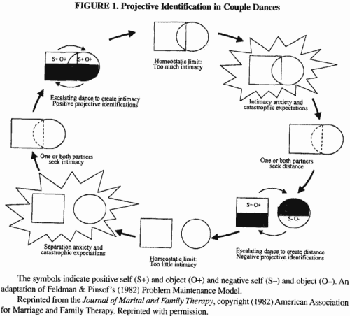 最早克莱因提出投射性认同是来说婴儿与母亲间的一种方式,一种原始的防御机制;在目前的精神分析的客体关系理论中,投射性认同是一个诱导他人以一种限定的方式来做出反应的行为模式,简单地说,就是一个人在经历过的互动中内化为自己的一部分(即一个人的内部关系模式)后,又将这些内心中的客体和主体应用于他的实际交往之中,而这涉及了对人的行为和情感的操纵。