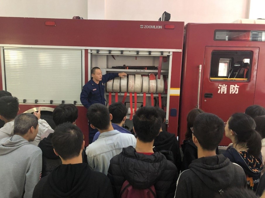 活动伊始,王班长展示了三种用于不同事故类型的消防车各自所配有的装备,并为大家介绍了各种装备的用途及其使用方法,让同学们对于消防车有了大致的了解。紧接着,惊心动魄的消防车高空灭火演示将活动推入高潮,从没有使用过灭火器的同学们在王班长的带领下依次使用干粉灭火器进行灭火,同学们基本掌握了灭火器的使用方法。