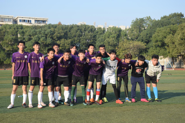 正式比赛还未开始时,队员们提前热身。大家斗志昂扬,激情澎湃,绕半个足球场慢跑两圈后集合,进行压腿。他们脸上洋溢的自信笑容与冬日的暖阳交相辉映,和谐的画面简单却美好,展现出了当代大学生的青春活力。