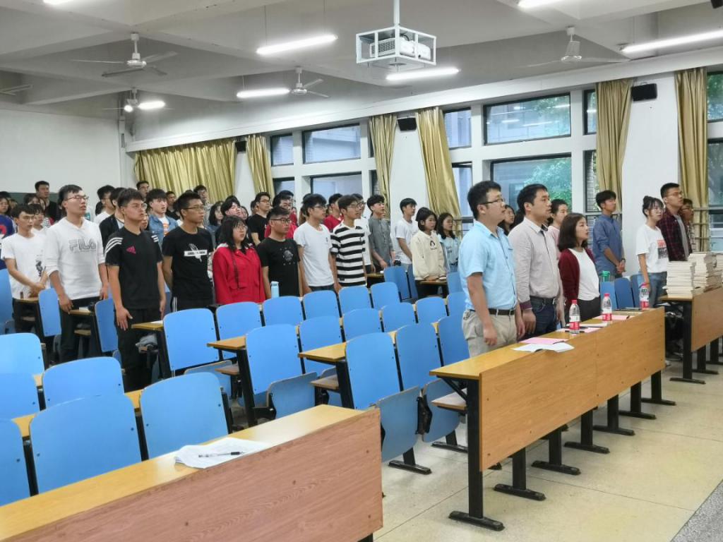 典礼第一项,主持人宣布典礼开始,全体起立奏唱国歌。