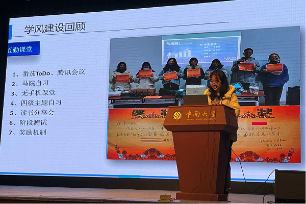 会议伊始,石晓琪老师回顾总结了第一学期的学习和生活情况。首先,石老师充分肯定了上学期学风建设系列活动的特色做法及取得的成效,同时希望同学们能继续弘扬优良学风,坚持问渠晨读、阳光晨练、五勤课堂、无手机课堂、班级自习、文明寝室、晚熄灯与晚查寝等良好习惯。随后,通过对上学期成绩的分析,石老师表扬了先进,也激励后进,鼓励同学们结对帮扶,组织主题学习活动和模拟考试等活动,做好学习和生活规划,争取新学期有更优异的表现。