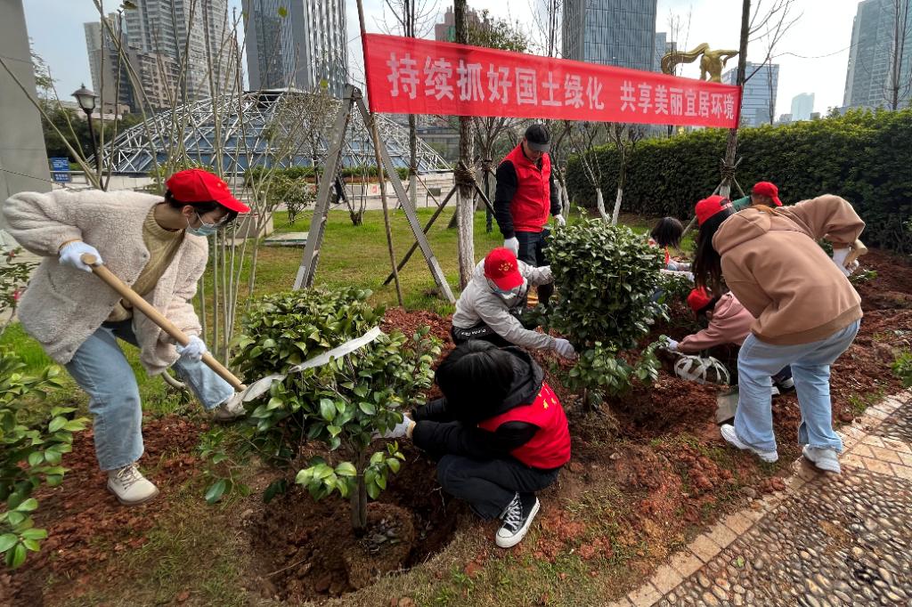 活动伊始,同志们依次签到,头戴志愿者服务帽、身穿红马甲、佩戴红袖章,整装待发。在绿化工作人员的带领下,同志们来到植树区域,戴上白手套,两三人一组。在听取了植树的技术要领后,同志们扛起锄头,挥起铁锹,分工协作,或扶树正苗,或铲土定植,或踩土压实,配合默契、热情高涨。最终,22名同志共栽种15棵树苗,为建设“绿水青山”贡献出了自己的一份力量。