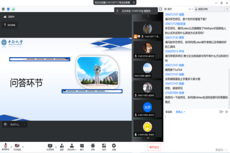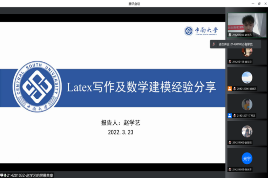 会议伊始,赵学艺围绕“latex写作与数模竞赛经验”主题进行了分享,结合亲身经历分享了海角网 过程中的创新想法、论文写作工具latex的使用方法、数学建模竞赛的参赛流程等方面的相关经验,并结合海角网 过程中遇到的具体问题向同学们讲解解决问题的方法,帮助同学们提升了海角网 写作能力并丰富了竞赛经验。