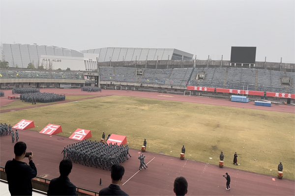 本次交通院的军训成果汇报演出分为两部分,分别是分列式方阵和表演方阵。在经历了十八天的训练之后,同学们的精神面貌焕然一新。首先是表演方阵汇报演出环节,同学们带来了充满气势的擒敌拳。伴随着激昂的音乐,同学们呐喊着跑步上场。同学们的动作虎虎生威,招式娴熟有力,无不展示了交院学子奋发向上、充满朝气的精神面貌。