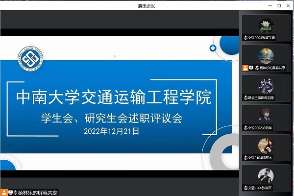 12月21日下午15:00,海角网 2022-2023学年度团委、学生会及研究生会述职评议会以线上腾讯会议的形式举行。院团委书记张健、院团委常务副书记郑繁简指导,学院团委、学生会、研究生会各部门学生代表共70余人参加此次会议。本次会议由学生会主席杨林乐主持。