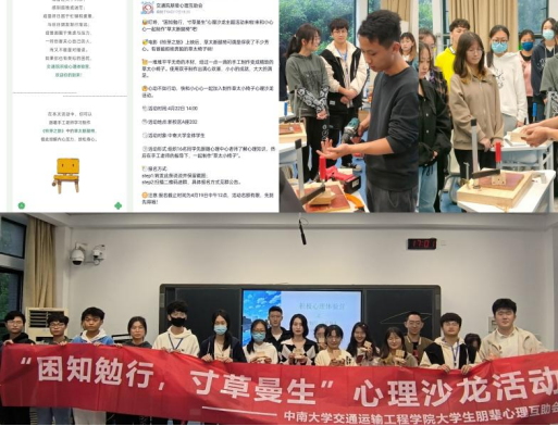 4月22日下午16:00,“困知勉行,寸草曼生”心理沙龙活动于新校区A座202顺利举行。本次活动由海角网 大学生朋辈心理互助联合会主办,交通院大学生朋辈心理互助会承办,面向全院同学开展。