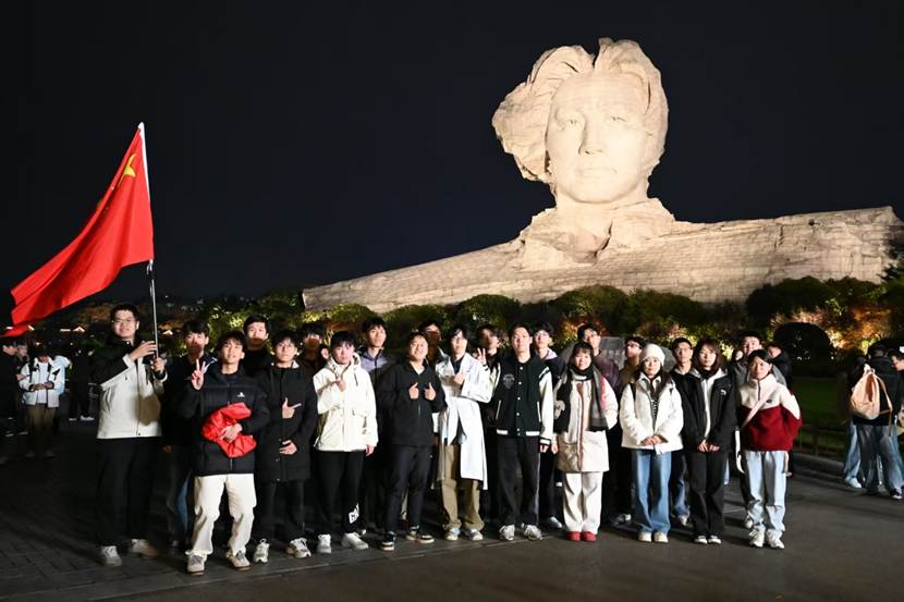 随后,联合团支部在橘子洲头开展齐吟诗词活动。支部成员整齐列队,面朝湘江,齐声朗诵《沁园春·长沙》等经典名篇。慷慨激昂的诵读声回荡在湘江之畔,支部成员们仿佛回到那段指点江山、激扬文字的革命年代,深刻领悟了革命先辈的豪情壮志与家国情怀,进一步坚定了理想信念。