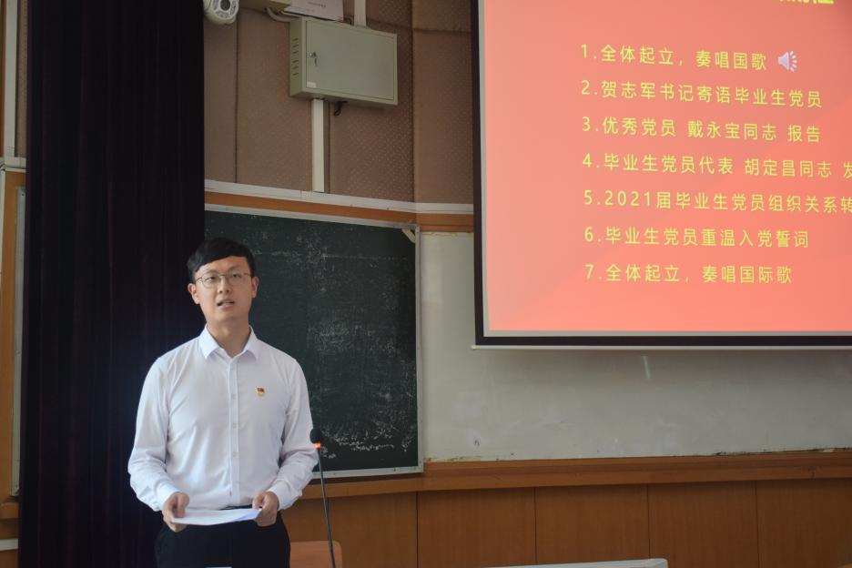 大会伊始,全体起立,奏唱国歌。随后,贺志军书记寄语2021届全体毕业生党员。他指出,自从建校以来,我校涌现了许多优秀党员,不断地为党的工作奉献自己的力量,这种奉献精神值得每一位党员学习。贺书记向全体毕业生党员提出了三点,以党性保持定力,时刻牢记自己是一名共产党员,不断锤炼党性,提高党性修养;以党性保持活力,肩负起党员责任,履行好党员义务;以党性保持先进性,以实际行动发挥党员的先锋模范作用,展示党员的优良品质。最后贺书记希望毕业生党员们不忘初心,继续前进,把自己的理想与民族的命运相结合,为实现中华民族伟大复兴贡献自己的力量。