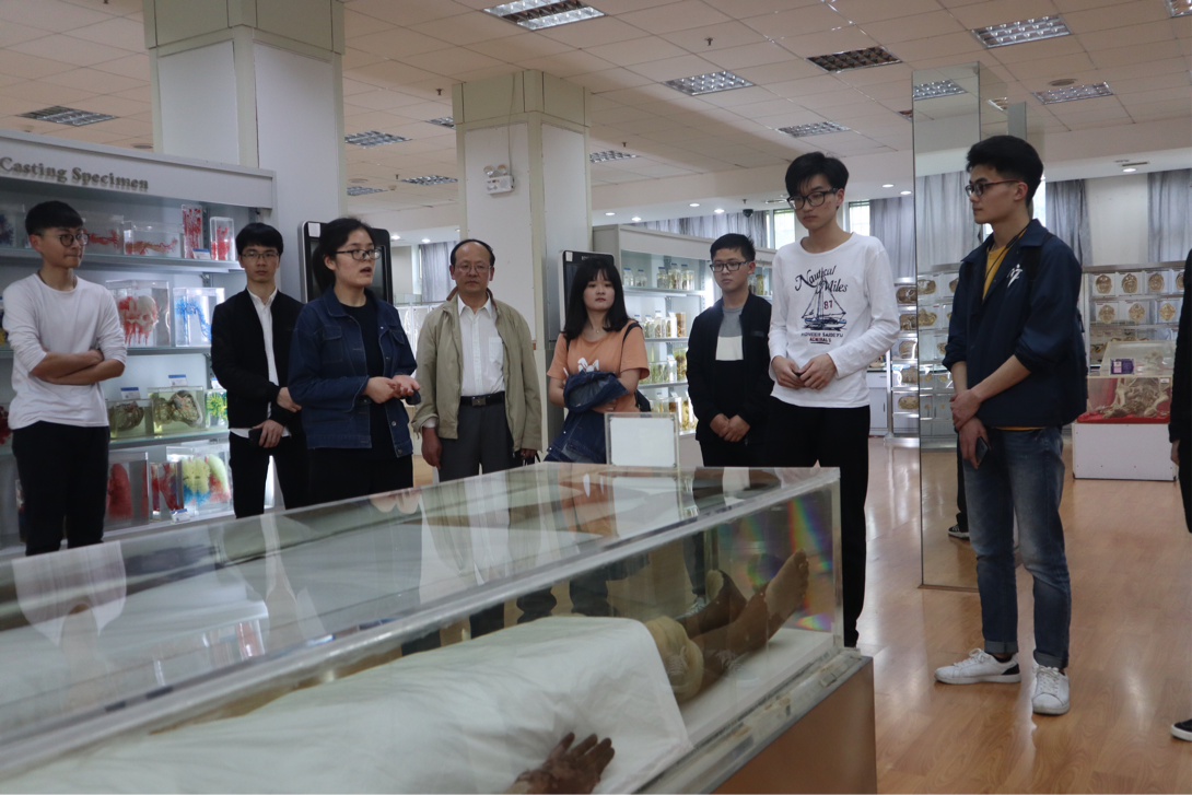 湘雅医学院的研究生志愿者带领大家,参观了位于湘雅医学院新校区医学形态楼一楼的人体形态学科技馆,科技馆面积400余平方米,科技馆按照人类起源、个体发生、人体形态分为三个区域、六个展区和一个多媒体演播厅,共有正常人体、病理及胚胎标本1200余件。科技馆拥有世界之最、身高2.43米的巨人遗体标本、清代干尸标本、封建社会妇女“三寸金莲”足骨标本、50-150万年前的脊椎动物化石标本等珍贵标本。